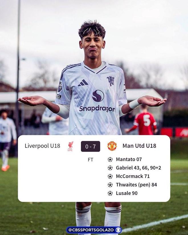 曼联15岁天才小将JJ-加布里埃尔在对利物浦的U18比赛中上演帽子戏法,其中一次精彩的个人突破进球让球迷称他为“正在成形的内马尔”。他已被阿莫林提拔进入一线队训练,并被视为曼联未来的重要新星。