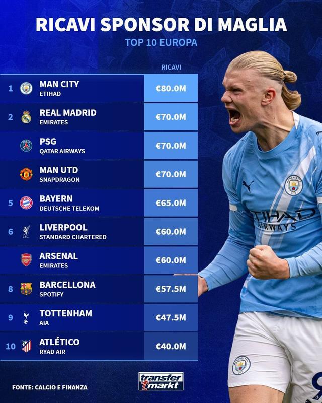 德转列欧洲俱乐部球衣胸前广告年赞助费TOP10:曼城8000万第1