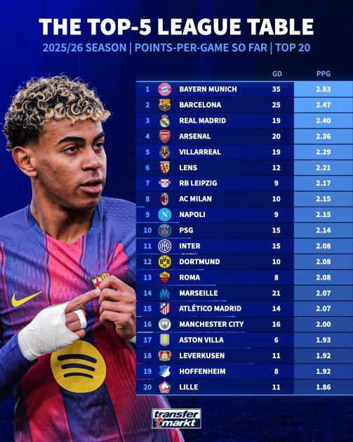 北京时间12月6日,德转统计出了本赛季至今欧洲五大联赛场均积分排名前20的球队,拜仁慕尼黑2.83分高居第一,巴塞罗那2.47分第二,皇家马德里2.40分第三。